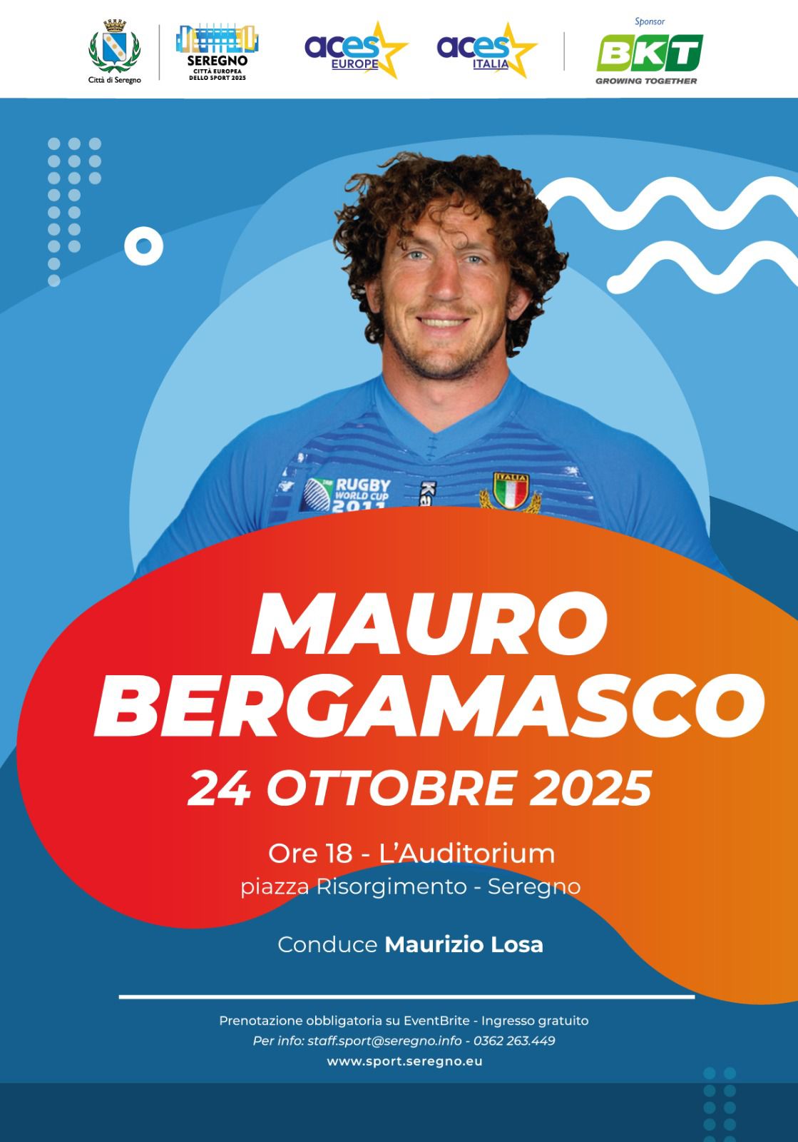 Venerdì 24 ottobre 2025, alle ore 18, presso L'Auditorium (Piazza Risorgimento, Seregno), si terrà un'intervista esclusiva a Mauro Bergamasco, campione e volto storico del rugby nazionale e internazionale. Mauro Bergamasco (classe 1979) è un ex rugbista a 15 italiano, in carriera terza linea ala vincitore di due scudetti col Benetton e due campionati francesi con […]